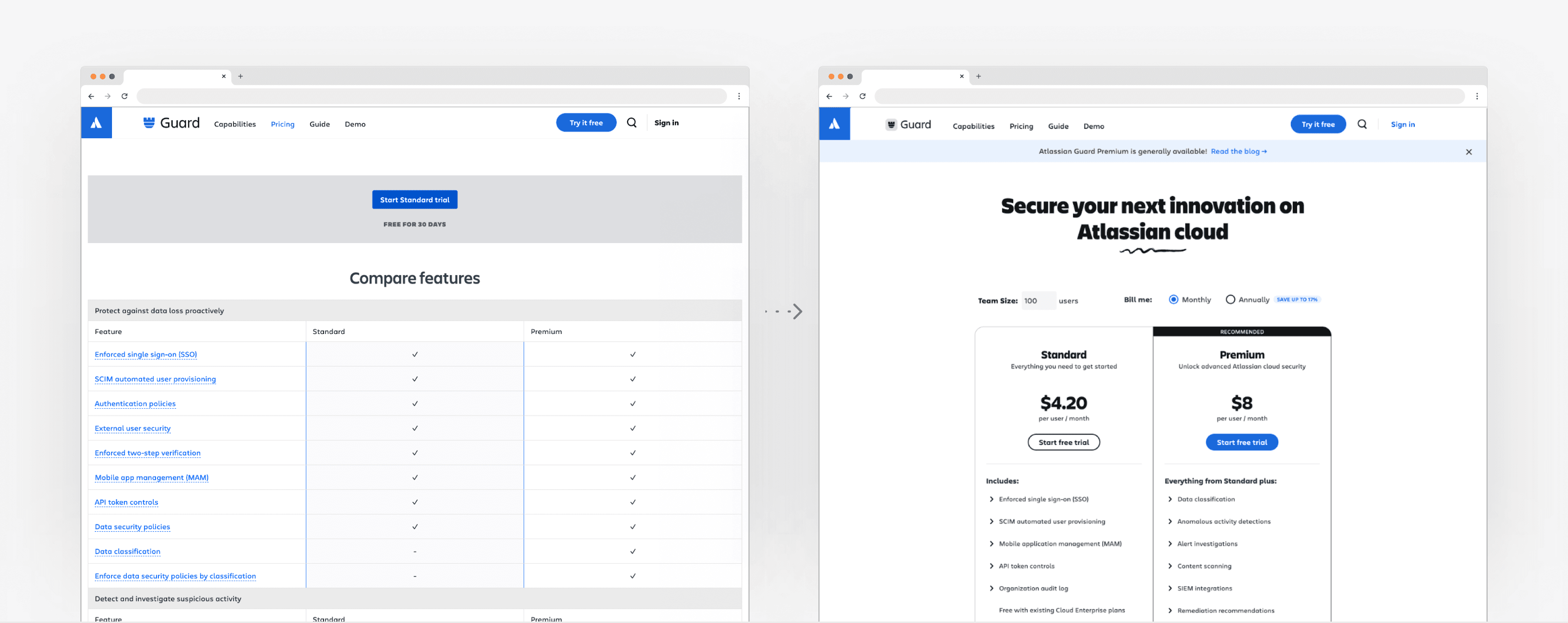 The premium callout contributed to the 14% increase in Atlassian Guard premium adoption within two months of the second launch.